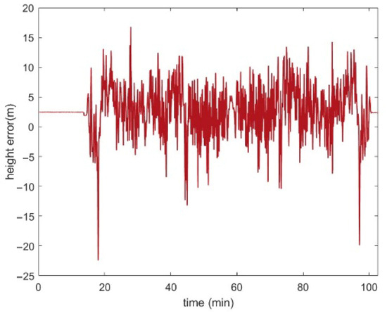 The DEM used in the experiment is provided by ZhongKeTuXin [39], as shown in Figure 16. The grid resolution of the DEM reached 0.81 m × 0.81 m. The accuracy of the height measurements was checked by comparing the heights measured by the INS/GNSS Navigation System with the terrain heights from the DEM at the corresponding latitude and longitude coordinates. The result of subtracting the two is shown in Figure 17, with a mean of 2.7278 m and a variance of 14.774 m2. As shown in Figure 16 and Figure 17, this area had significant undulation and numerous self-similar terrains. Additionally, the measurement variance is relatively large, which may have been attributed to map errors or inaccuracies in satellite navigation. In general, this experiment presented a significant challenge to the robustness of the TAN algorithm.