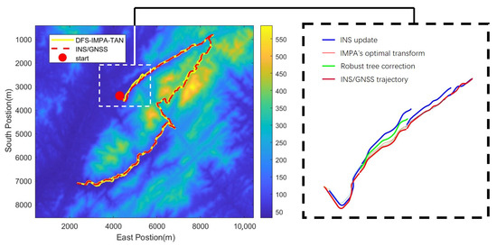 Navigation results of DFS-IMPA-TAN for the in-vehicle experiment and the correction effect of the robust tree.