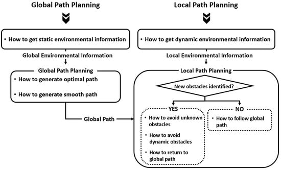 Path planning flow chart. Global path planning focuses on generating an optimal path based on static environmental data, whereas local path planning emphasizes real-time adaptation to dynamic environmental changes.