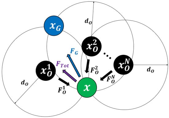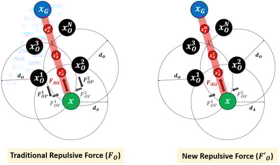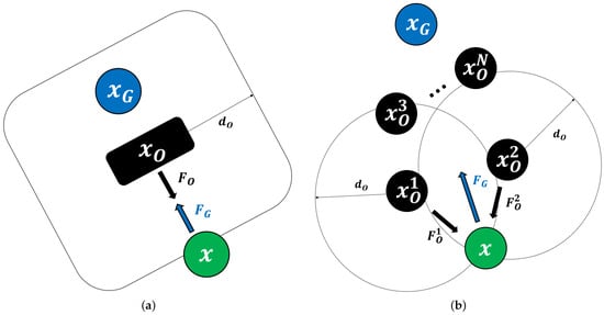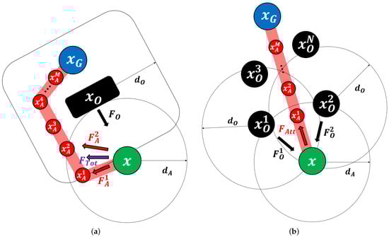 In the traditional APF, when the total force acting at the becomes zero, the method cannot determine a direction to move, which means the path terminates at the called a local minimum problem. As shown in Figure 4, a local minimum situation in APF occurs in two cases.