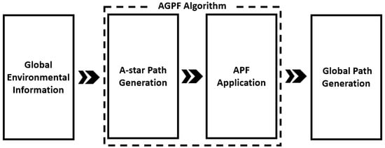 The AGPF algorithm for global path planning consists of four modules: Global Environmental Information, A-star Path Generation, APF Application, and Global Path Generation, as shown in Figure 5.