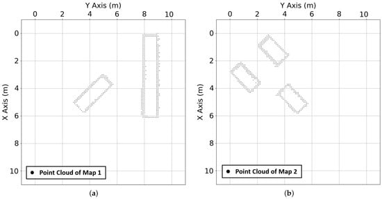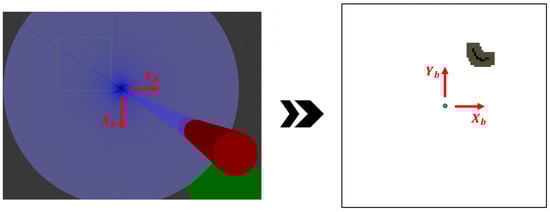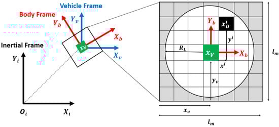 where is the detection range of the sensor. The grid map is fixed to the body frame of the vehicle, with the vehicle’s position always located at the center of the map. The relative position of an obstacle with respect to the vehicle is denoted as , and the corresponding position of the obstacle on the map is determined using Equation (17).