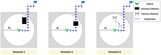 In Scenario 1, unknown static obstacles are absent from the global path. Scenario 2 involves unknown static obstacles obstructing the global path, while Scenario 3 considers dynamic obstacles in the surrounding environment.