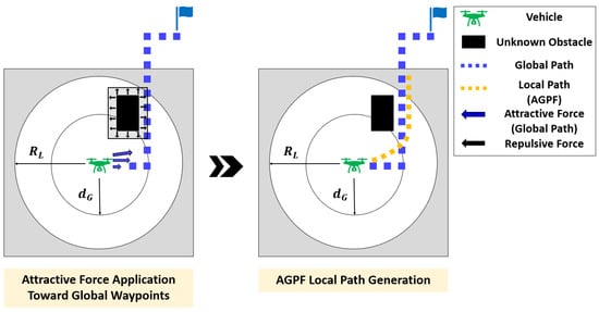 The local path generation method for Scenario 1 is described in Figure 10. Since the unknown obstacle is not located on the global path, there is no need to generate an entirely new path. Nevertheless, as the global path was planned without accounting for this obstacle, a potential risk of collision still exists. To address this, a local path is generated using the AGPF algorithm, which incorporates both the attractive force toward global waypoints within a specified range and the repulsive force from the detected obstacle. The parameter functions similarly to , but it defines the distance at which the attractive force toward global waypoints begins to act, rather than A-star waypoints.