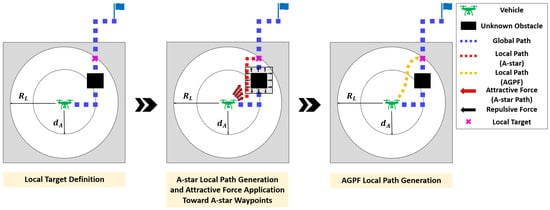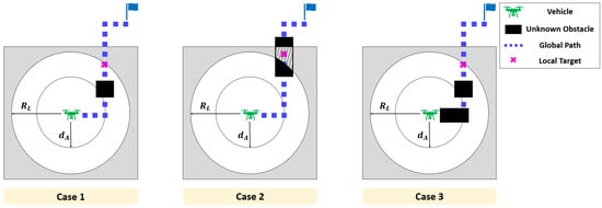 The procedure for selecting the local target is illustrated in Figure 12. If the detected obstacle is fully contained within the sensor’s detection range (white area), a global waypoint located behind the obstacle is selected as the local target, as shown in Case 1. However, if the obstacle is detected near the boundary of the sensor range, it may not be fully represented within the white area. In this case, selecting a waypoint behind the obstacle may be infeasible, as it lies outside the grid map. Instead, as shown in Case 2, a global waypoint located outside the sensor range but still within the grid map (gray area) is chosen as the local target. Since this region is unoccupied, it provides a valid reference point for path generation. Additionally, in situations involving multiple obstacles along the global path—as illustrated in Case 3—the algorithm selects a waypoint located behind the farthest obstacle from the vehicle. Once the local target is determined, an A-star path is generated toward it. The vehicle then constructs an AGPF-based local path by applying attractive forces toward the A-star waypoints within range and repulsive forces from the surrounding unknown obstacles.