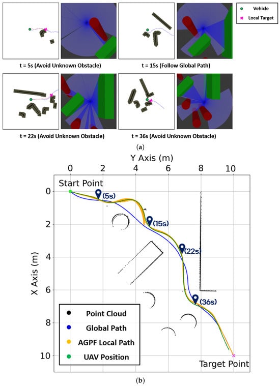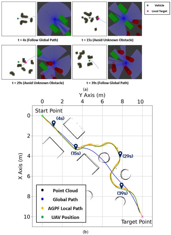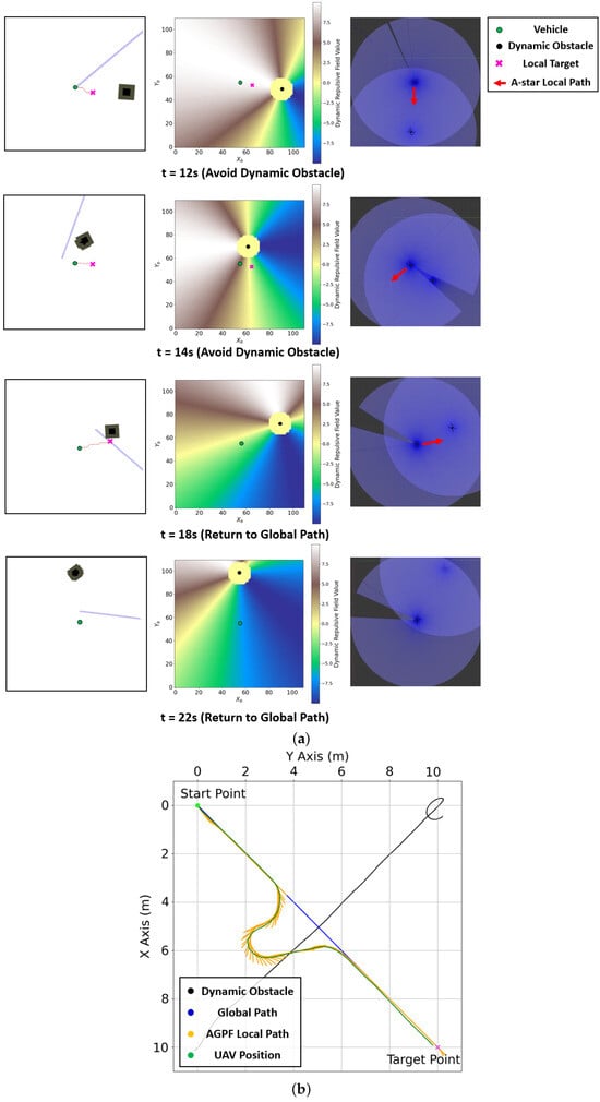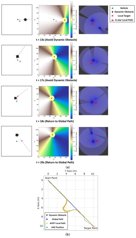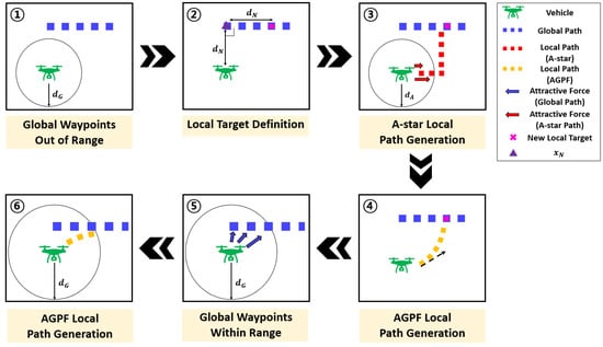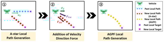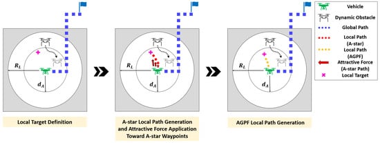Finally, the process for generating avoidance paths in Scenario 3, where dynamic obstacles are present around the vehicle, is illustrated in Figure 13. A local target is selected in a direction that facilitates safe avoidance of the dynamic obstacle. An A-star path is then computed toward this target, followed by the generation of an AGPF-based local path using attractive forces toward the A-star waypoints.