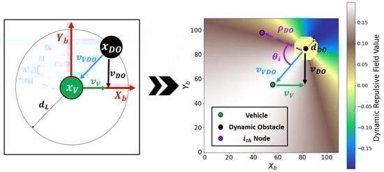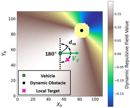 The effectiveness of dynamic obstacle avoidance heavily depends on how the local target is selected; thus, developing a reliable target selection strategy is essential. In this context, it is assumed that the vehicle has access to both the position and velocity of the dynamic obstacle. The dynamic repulsive field generated as the obstacle approaches the vehicle with a relative velocity is illustrated in Figure 14 and defined in Equation (18).