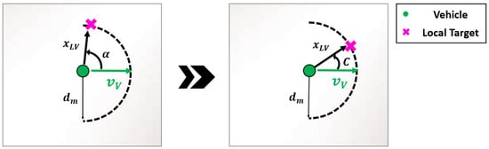 As illustrated in Figure 16, setting the local target in a direction that forms a large angle with the vehicle’s velocity vector can lead to abrupt changes in heading, potentially compromising maneuvering stability. To mitigate such sudden directional changes, a constraint is applied to the angle between the velocity direction and the local target, as defined in Equation (20).