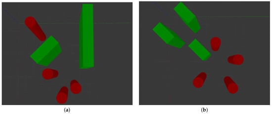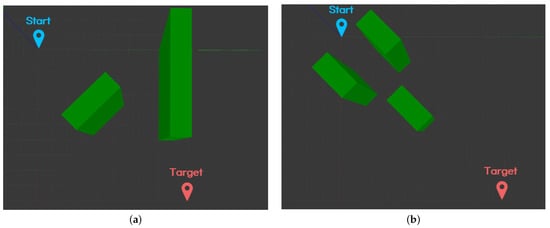 Examples of local minima in APF: (a) the obstacle blocks the vehicle’s path to the target; (b) the vehicle passes through a narrow space between obstacles.