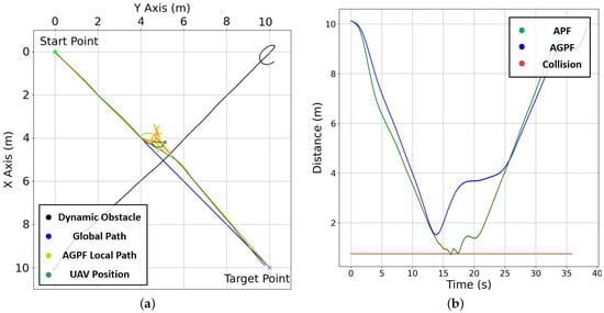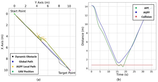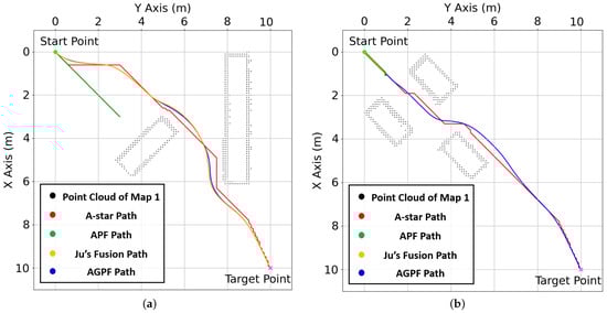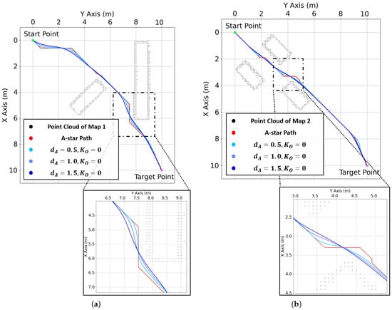 where is the sum of attractive forces toward M A-star waypoints; is the A-star waypoint’s attractive force. In the traditional APF, the attractive force is directed solely toward the target rather than toward obstacle avoidance. When the target, an obstacle, and are aligned, the obstacle blocks the vehicle’s path to the target, causing it to become trapped in a local minimum. On the other hand, the AGPF algorithm applies attractive forces toward A-star waypoints, guiding the vehicle along a path that detours around obstacles, as illustrated in Figure 6a. This approach ensures that the AGPF can create feasible paths without becoming stuck in a local minimum.