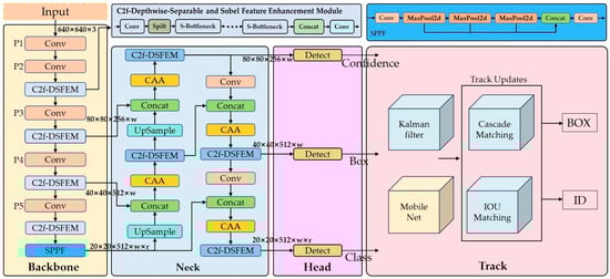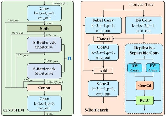 The C2f (Cross-Stage-Partial) module employs a cross-stage partial linking technique to integrate disparate levels of features, thereby enhancing the detection capability of targets across multiple scales. However, in scenarios involving UAV detection, the generic design of the C2f module has been found to be ineffective in the extraction pertaining to small targets’ features when confronted with the task of small-target detection. This has resulted in instances of misdetection and omission []. To mitigate these limitations, this paper proposes a lightweight Depthwise-Separable and Sobel Feature Enhancement Module (C2f-DSFEM). The proposed module aims to leverage the respective advantages of Sobel convolution [] for edge-sensitive feature extraction and Depthwise-Separable convolution [] for efficient spatial filtering. By processing and fusing input features from complementary perspectives, the C2f-DSFEM module generates more expressive and information-rich feature representations, which are beneficial for subsequent tasks such as UAV detection and tracking. The module’s key concept is centered on integrating features extracted via different convolutional mechanisms, thus boosting the model’s capacity to seize structural and textural details alike in input images. This modification greatly enhances the feature representation ability of the architecture, especially for small and low-resolution targets in challenging environments.
