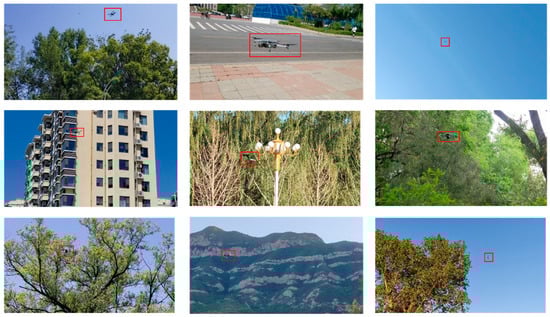 In practical UAV detection scenarios, dataset quality exerts a direct impact on algorithmic accuracy. Currently, several publicly available UAV datasets exist, such as DUT-Anti-UAV [], MIDGARD [], Real World [], Det-Fly [], and USC-Drone [], which are characterized by their large scale and rich content diversity. In this paper, considering the specific application scenario of detecting and tracking small UAV targets, we construct a specialized UAV dataset. This dataset takes into account various UAV attitudes and sizes caused by different motion states, diverse camera shooting angles, and the influence of complex environmental conditions. The original data are primarily sourced from the aforementioned public datasets. In addition to these publicly available resources, a small portion of the dataset is composed of self-collected UAV images, along with another portion derived from self-recorded video sequences. The drone model used is the DJI Mini 2, with flight heights ranging from 10 m to 100 m. The recording locations include both campus and off-campus environments. A schematic diagram of the dataset section is shown in Figure 5.