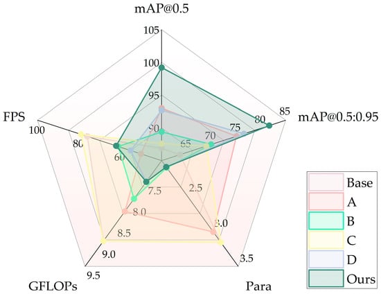Model D incorporates both the C2f-DSFEM module and the CAA attention mechanism, achieving an mAP@0.5 of 92.7% and an mAP@0.5:0.95 of 76.6%, indicating a further improvement in detection accuracy. The number of parameters is 2.1 × 106, with the computational cost reduced to 7.5 GFLOPs, while the frame rate is maintained at 55.0 frames·s−1. These results demonstrate that the synergistic integration of the two modules enables more effective feature extraction and target focus, achieving higher detection performance with lower computational resource consumption. However, there is still room for improvement in terms of inference speed.