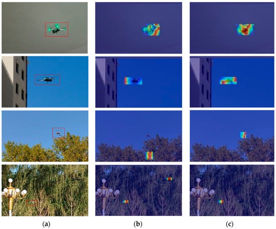 As demonstrated in Figure 7, the Grad-CAM heat map (b) of the original YOLOv8 model demonstrates an inadequate focus on the UAV area, and the model frequently misidentifies the UAV target in complex backgrounds. This finding suggests that the model is susceptible to environmental interference. Conversely, the heat-map (c) of the enhanced YOLOv8 model precisely localizes UAV targets. The high gradient regions in the heat map are more concentrated on the key structural components of the UAV, such as the fuselage and support components. Examination of the visualized outcomes reveals that the enhanced YOLOv8 model developed herein significantly mitigates background noise interference, thereby allowing the network to direct attention more precisely toward the actual UAV target. This capability, as validated through empirical testing, substantially improves detection robustness and operational reliability.