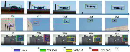 To demonstrate the tracking results more intuitively, this study conducts visualization experiments based on YOLOv3, YOLOv5, YOLOv8, and the improved YOLOv8 detector. The experiments are performed using multiple continuous frame sequences: frames 22–152 from video1.mp4, frames 1–331 from video 2.mp4, and frames 1–13 from the Anti-UAV-RGBT [] dataset. The comparative analysis is conducted across four dimensions: detection box stability, ID continuity, dynamic adaptability, and anti-interference capability. These experiments validate the improved algorithm’s effectiveness, meanwhile furnishing a theoretical basis for engineering UAV tracking technology applications.