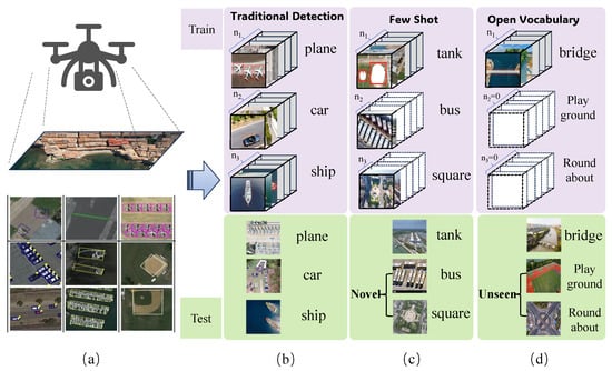 Comparison between traditional closed-set detection, few-shot detection, and open-vocabulary detection. (a) UAV image object detection. (b) Traditional closed-set detection: All test categories have appeared in the training set. (c) Few-shot detection: Some of the test categories have only a few training samples. (d) Open-vocabulary detection: Some categories have never been seen in the training set, only their names are provided.