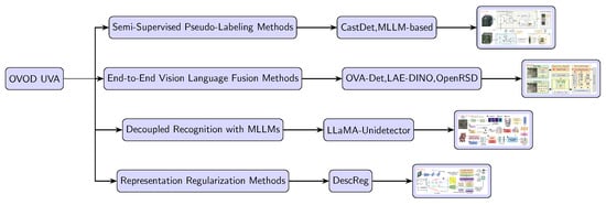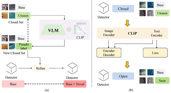 The rapid development of OVOD has led to many different methods. While early methods for ground-view images could be easily grouped, drone images create special challenges that need custom solutions. To help organize these methods, this section divides up OVOD approaches made for aerial images. According to how they learn to recognize new objects, we divide the current methods into two major types. (1) Pseudo-labeling methods: These help when there are not many labeled drone images. They use a teacher–student system to create labels for unlabeled images, which helps the model learn better. (2) CLIP-driven integration methods: This is the most common approach. It adds CLIP’s ability to recognize objects without training (zero shot) into different object detectors. The related methods as shown in Figure 3
