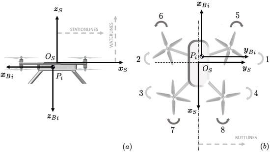 A sketch of the i-th UAV including the selected reference frames is reported in Figure 1.