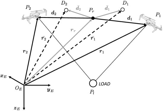 The hypotheses in Lemma 1 and the definition of error uniquely determine desired formation geometry, which is depicted in Figure A1. The condition in which each vehicle reaches the desired position (, , ) and the formation center of gravity G exactly tracks (, ), implies that , , , and G lie all on a local vertical plane. In this case, the relative distance vectors and are organized according to a symmetric configuration that makes the derivation of results in Equation (23) straightforward. In order to evaluate and , the equilibrium of forces acting on the payload along the local vertical is analyzed. To this end, let be the i-th elastic force intensity in the equilibrium condition (see Equation (8)), where and are, respectively, desired cable elongation and length. Taking into account Equation (5), it is