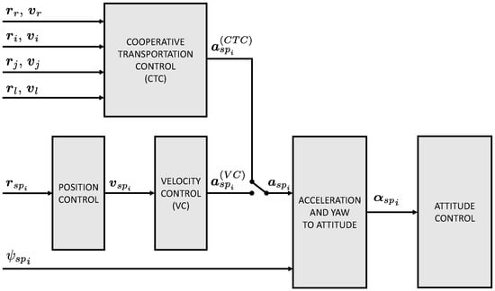 The elastic force in Equation (8) is calculated from , that with respect to the classical Hookes’ model also accounts for cable internal damping by the coefficient C. Guidance, navigation, and control tasks are performed, without loss of generality, through a cascaded controller based on PX4 architecture and notation []. The control solution is assumed to stabilize the i-th multirotor according to different flight modes that include the tracking of an Earth-fixed set-point position , velocity , or acceleration (see Figure 3, where is the acceleration set-point generated by Velocity Controller). In this framework, desired acceleration for the i-th multirotor is obtained as , where is calculated according to the Cooperative Transportation Controller (CTC) in Equation (31). To get a better insight into the performance of the cooperative controller, a classical stabilization method is discussed as an alternative to the proposed solution. Taking into account Figure 3, it is assumed that set-point acceleration of vehicle i is generated by Velocity Controller (VC) rather than by cooperative transportation algorithm, namely . Provided a detailed analysis of PX4 control functions is out of the scope of the present paper, it is supposed that inner-loop stabilization of attitude parameters is performed with prescribed requirements in terms of accuracy and rapidity, according to Remark 2. Non-ideal sensor behavior is considered in terms of noise and sensor positioning errors. The on-board computer is located at m and m, with axes aligned with -axes. In order to simulate the effects of sensor noise on attitude control, zero-mean Gaussian white noise is added to each Euler angle and angular velocity measurement, with standard deviations deg and deg/s, respectively. The on-board computer generates control signals at a sampling frequency of 100 Hz (sample time s). Finally, a fixed time delay s is added to account for local processing and communication issues between the agents of the formation.