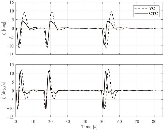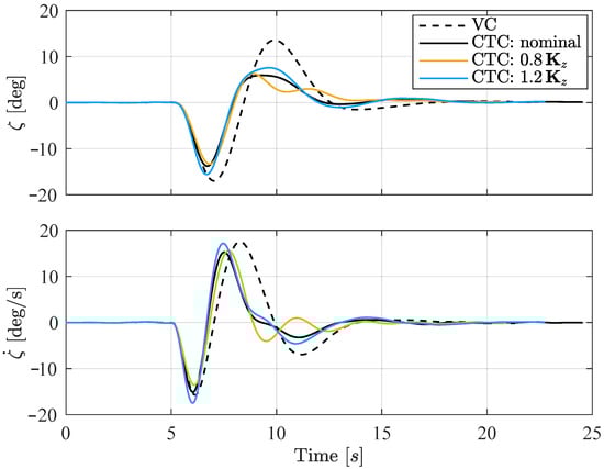 Firstly, the exponential stability of is addressed in the case when . Equations (27)–(30) with the control law in Equations (31)–(38) provide: