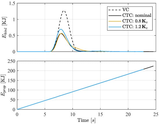 - Total propulsive energy, . It is the mechanical energy delivered by electrical motors to propellers, calculated by the integralwhere is the output shaft power generated by the j-th motor, , obtained from required torque and angular rate under the assumption of null friction torque. Without loss of generality, is calculated for Agent 1 only.