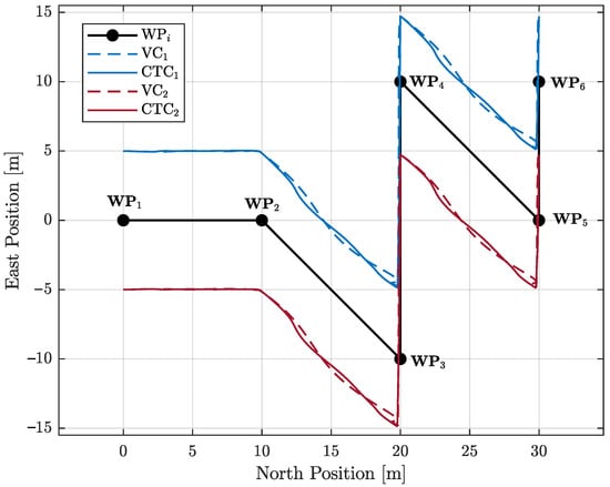 Figure 7 depicts the reference and the multirotors trajectories over the horizontal plane – for the two control strategies, both of which achieve accurate waypoint tracking. Despite receiving an acceleration setpoint rather than a direct position setpoint as reference input, the CTC allows for slightly smoother transitions, especially near abrupt path changes, suggesting enhanced formation coordination.