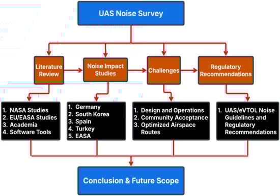 By contrast, our survey is unique in following key aspects that are primary objectives of this paper: (i) to examine acoustic challenges associated with drone related UAM operations, (ii) to survey current noise prediction and reduction approaches, (iii) to highlight public perception studies relevant to urban drone integration, and (iv) to evaluate implications for regulatory and airspace route planning. The survey highlights recent international initiatives and regulatory developments, offering insights that can inform both technical and policy frameworks for integrating noise-aware drones. The rest of the paper is structured as follows. Section 2 presents a literature review of existing noise prediction and mitigation approaches with the current software tools to predict and mitigate noise exposure; Section 3 presents the noise impact studies by various countries and provides public perception of UAS and drone noise studies. Section 4 provides challenges encountered during the design phase and community acceptance and makes assumption about optimized airspace routes. Section 5 highlights the regulation of general aviation noise and provides recommendations about future UAM noise regulatory considerations in the U.S. Given these challenges, the paper ends with a conclusion. Figure 1 illustrates the article’s structure following the progression from foundational NASA and academic noise prediction tools, through international noise impact studies, to design challenges, community acceptance considerations, and relevant regulatory guidelines.