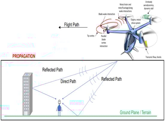 In [24], NASA presented a technique to forecast the noise exposure of UAM at the source, strategies to evaluate and limit the impact on the community. A thorough analysis is required to evaluate a variety of operating situations inside the flight envelope, where the vehicle is appropriately sized for the intended mission. This research identifies various aircraft configurations, including trimmed states, acknowledging that a single operating condition may correspond to multiple trimmed configurations due to redundant control systems in many UAM vehicles; some configurations inherently generate higher noise levels than others. For each such trimmed configuration, one can calculate noise contributions from components like steady and unsteady rotor noise, as well as propulsion–airframe–aeroacoustic interactions. From these calculations, three-dimensional sound radiation patterns (commonly called hemispheres) are generated. Hemispheres represent how sound emanates from a noise source (e.g., rotors or other aircraft components) in space. These hemispherical datasets serve multiple purposes: they inform noise certification analyses, feed into auralization workflows (translating numerical noise data into audible sound), support land-use planning through simulation and modeling tools, aid in developing low-noise operational procedures via flight simulators, and guide acoustic-aware flight control strategies. Figure 2 (adapted from NASA) depicts how an eVTOL aircraft’s noise reaches a ground observer, emphasizing principal noise contributors such as rotor–rotor and rotor–fuselage interactions and showing both direct sound paths and reflections off buildings and terrain.