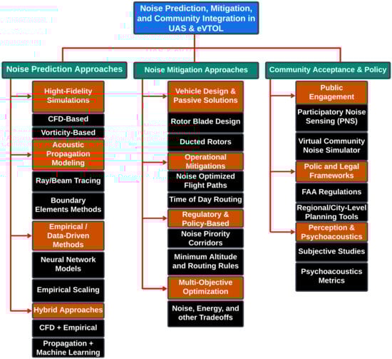 Figure 4 presents a taxonomy of noise prediction and mitigation strategies for UAM. The hierarchy is structured around three main research objectives: (i) noise prediction approaches, (ii) mitigation techniques, and (iii) community acceptance and policy measures. Within each branch, methods are categorized based on their modeling fidelity, intervention type, or stakeholder interaction level. For example, noise prediction includes both high-fidelity CFD simulations and data-driven learning models, while mitigation strategies span from rotor design to regulatory corridor planning. Community integration is categorized by public engagement tools, regulatory frameworks, and subjective perception studies. This organization aims to reflect both the technical depth and interdisciplinary nature of the field. This diagram provides an integrated view of the diverse research efforts aimed at addressing noise challenges in UAM operations.