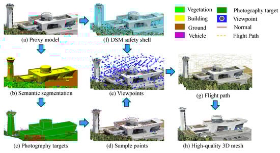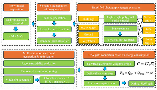However, UAV path planning for fine-grained 3D reconstruction encounters numerous challenges. On the one hand, in practical operations, most existing methods rely on manually delineating target areas before generating flight paths, which is time-consuming and inefficient. On the other hand, some researchers have proposed automated flight path generation methods based on coarse initial 3D meshes (referred to as proxy models) which help reduce manual intervention [10,11,12]. These methods are mostly focused on architectural objects and typically adopt very close-range photography to acquire high-resolution images. In the planning process, they rely solely on the geometric information of the proxy model while neglecting semantic information [13]. As a result, when applied to complex scenes, they tend to collect large amounts of redundant image data in non-architectural areas.