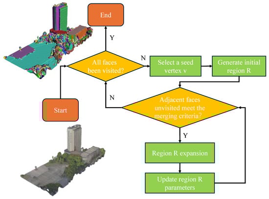 To ensure local consistency in subsequent planar feature extraction and classification, and to avoid redundant computations on numerous triangular faces, this paper first performs plane segmentation on the input proxy model. The main steps include seed vertex selection and initial region construction, followed by region growth and iteration. The detailed procedure and segmentation results are shown in Figure 3: