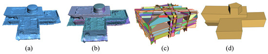 Lightweight polygonal surface reconstruction of building areas. (a) Preprocessed 3D point cloud. (b) Result of the plane segmentation. (c) Spatial slicing. (d) Reconstructed result.