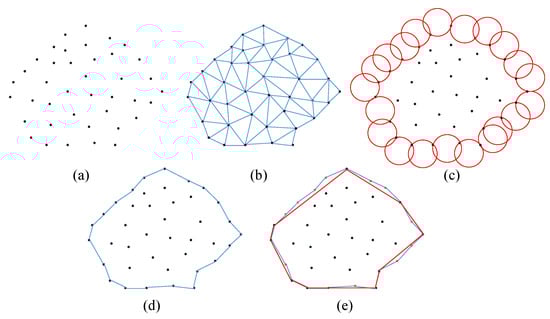 To accurately reconstruct the surface boundaries of these regions, this paper first preprocesses the projected point set S using the Delaunay triangulation algorithm [52], then employs the alpha-shape algorithm [53] for boundary extraction. The alpha-shape is a generalization of the convex hull and can more precisely extract the boundary of the input point set based on a control parameter . The basic principles and steps are as follows: