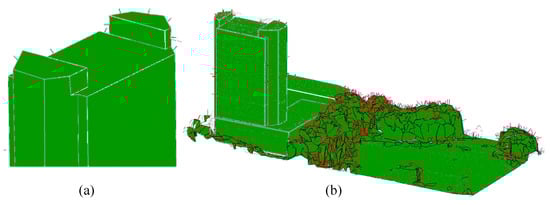 As a result, the entire scene to be reconstructed is represented by a combination of surface targets, line targets, and point targets. Figure 6a illustrates the building area, where the normal vectors of line targets are calculated by summing the unit normal vectors of adjacent surfaces. Figure 6b shows the entire 3D scene. Regions with dense normal vectors correspond to point targets in non-building areas, while sparser normal vectors on the ground represent surface and line targets in non-building areas.
