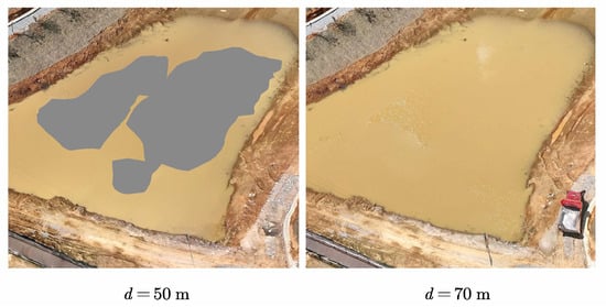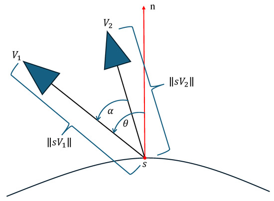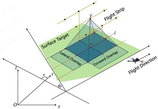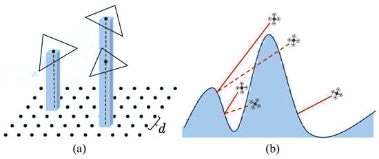As shown in Figure 7, represents the parallax angle between the two connecting lines and ; is the larger of the two observation angles formed by the sample point’s normal vector and the two connecting lines. The distance d represents the larger distance of the two connecting lines, namely . Additionally, and are two constants, typically set to 32 and 8; constants and , which are set to and , are approximately used for the lower and upper limits of the parallax angle to reduce the error of aerial triangulation. The distance is used to limit the maximum photography distance. In this paper, it is set to twice the photography distance corresponding to the required ground sampling distance (GSD).