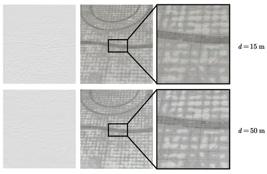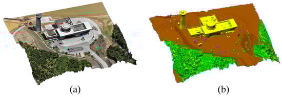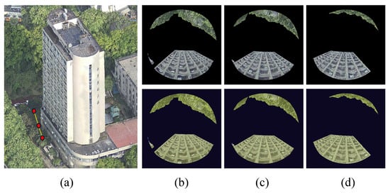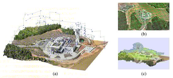 In this paper, oblique photogrammetry is achieved by planning a 2D grid-shaped flight path at a fixed altitude, while the UAV gimbal sweeps during flight to capture multi-angle images of the real-world scene. The oblique photogrammetry flight route used in this section is shown in Figure 18b and was planned using DJI’s Pilot2 software on the Mavic 3E platform. Considering the presence of tall buildings in the scene, such as the astronomical observation tower, the photography distance is set to 50 m, corresponding to a GSD of 1.375 cm/pixel. This photography distance is also close to the 45 m used in the proposed method for the lowest resolution level (3 GSD).