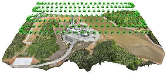 In the same scene, UAV path planning was also performed using Metashape (version 2.2.0, build 19630). The proxy model used in this method is the same as that used in the proposed method. However, unlike the proposed method, Metashape does not consider semantic information of the scene; instead, it generates sample points directly on the surface of the proxy model based solely on its geometric features. In the MS method, a 2D area of interest is first delineated on the proxy model, and flight routes are then generated using the Mission Plan function by specifying the photography parameters. For a fair comparison, the flight parameters such as photography distance and overlaps were set to be consistent with those used in the proposed method. Specifically, the photography distance was set to 15 m, corresponding to a GSD of 0.412 cm/pixel. The resulting flight path, as shown in Figure 18c, contains a total of 888 viewpoints.