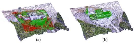 Preprocessing. Based on the results of semantic segmentation, the building area is extracted by calculating the area of the triangular face connected regions classified as buildings and the elevation difference within the region. Two corresponding thresholds are then set to filter out small misclassified areas as buildings. After extracting the building area, the paper samples it as a point cloud.
