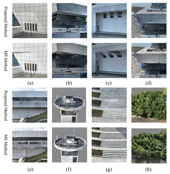 Regarding the completeness and visual quality of the 3D models, Figure 20 presents a comparison between the results obtained by the proposed method and the MS method. In Figure 20a–c, excluding the glass surfaces that are inherently difficult to reconstruct, the refined 3D mesh generated by the proposed method shows better preservation of architectural geometry. In contrast, in Figure 20d,e, the model produced by the MS method contains numerous holes on building surfaces, particularly evident in Figure 20e, indicating that the viewpoints generated by Metashape were suboptimal for such structures, leading to image matching failures. In Figure 20f, the reconstruction result of the observatory roof obtained by the proposed method is less accurate. This may be due to an insufficient number of extracted photography targets representing the geometric features of the structure, resulting in a sparse distribution of viewpoints. In Figure 20g, although the proposed method uses a doubled photography distance (30 m) for ground targets compared to the 15 m used in the MS method, the reconstruction quality remains comparable. In Figure 20h, for vegetation areas, the proposed method uses a tripled photography distance (45 m), significantly reducing the number of viewpoints. Nevertheless, it achieves even better reconstruction quality, suggesting that appropriately increasing the photography distance for vegetation can enhance feature extraction and lead to improved reconstruction results.