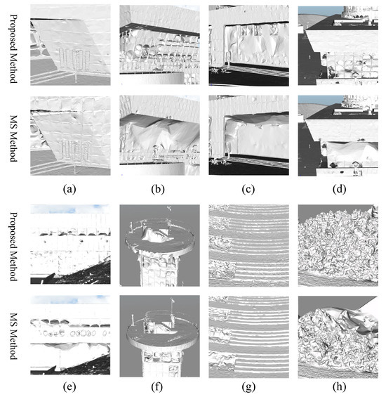 Texture comparison of 3D meshes obtained by the proposed method and the MS method. (a,d,e) Lateral facades. (b,c) Eaves. (f) The observatory roof. (g) Ground areas. (h) Vegetation regions.