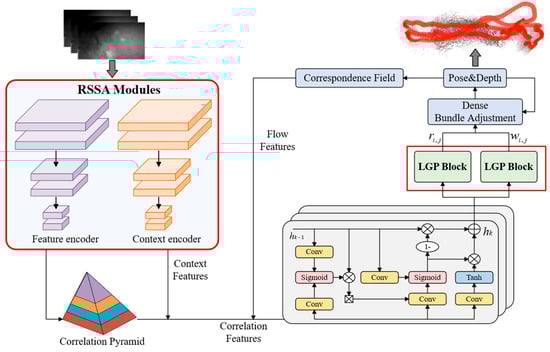 The RSSA modules extract dense semantic and spatial features from input images. The Correlation Pyramid computes all-pairs dot-product correlations between adjacent frames, forming a 4D volume, which is then downsampled and interpolated to obtain multi-scale features. These features, along with flow residuals and contextual information, are refined by ConvGRU and passed to the LGP block. The LGP subsequently predicts flow corrections and confidence weights, enabling recursive optimization of pose and depth. The DBA layer integrates Gauss–Newton optimization to solve for joint pose-depth updates using Schur complement decomposition, weighted by learned confidences for enhanced accuracy. The RSSA module improves semantic–spatial awareness and feature robustness through residual connections, while the LGP block enhances the representation of blurred underwater boundaries and models global dependencies using self-attention. By fusing both local and global cues, RAEM-SLAM effectively reduces pose estimation errors and improves robustness in challenging underwater conditions.