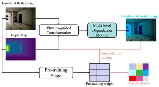 To enhance the adaptability and robustness of the RAEM-SLAM system in complex and dynamic underwater environments, and to bridge the significant domain gap between its training data (typically terrestrial scenes) and real underwater scenarios, we propose a Physics-guided Underwater Adaptive Augmentation method (PUAA), as illustrated in Figure 2. Through precisely simulating the physical process of underwater light transmission, PUAA can dynamically transform easily obtainable terrestrial scene datasets (containing RGB images and their corresponding depth maps) into physically realistic pseudo-underwater images for training RAEM-SLAM. Unlike traditional augmentation methods that alter only spatial or low-level image features like rotation or cropping, PUAA systematically models semantic-level features unique to underwater scenes including light attenuation, scattering, and suspended particle noise.