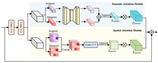 where denotes a convolution operation with a 3 × 3 kernel, and represents the ReLU activation function. BatchNorm refers to batch normalization. After feature extraction, the resulting feature maps are enhanced by both the Semantic Attention Module and the Spatial Attention Module.