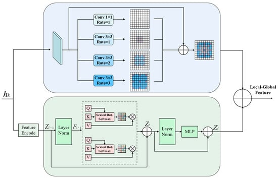 The proposed multi-scale local perception module utilizes multiple parallel heterogeneous convolutional branches to fully extract local details at different scales. Its structure is illustrated in the blue part of Figure 4. Specifically, the hidden state output from the GRU is processed through four parallel branches, each designed to capture local features with distinct receptive fields. The first branch applies a 1 × 1 convolution kernel, which preserves high-resolution local details while preventing spatial information loss due to downsampling. The second branch employs a 3 × 3 convolution kernel to capture basic local features and short-range dependencies. The formulation for this operation is as follows: