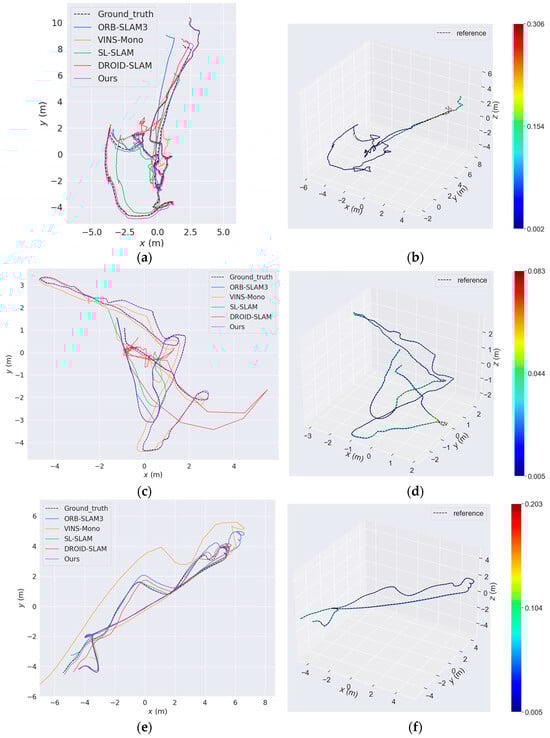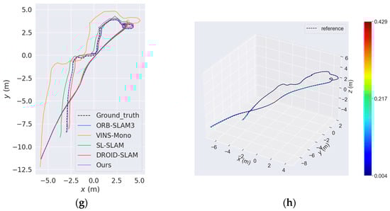 The AQUALOC [] dataset is a publicly available underwater dataset collected by remotely operated vehicles (ROVs) on the seafloor. Within this dataset, the archaeological dataset section contains 10 sequences collected from depths of several hundred meters, which were recorded with a 20 Hz monocular camera at a resolution of 968 × 608. For our comparative experiments on this dataset, we selected the following methods: the traditional feature-based ORB-SLAM3 [], the multi-sensor VINS-Mono [] which fuses Inertial Measurement Unit (IMU) data, SL-SLAM [] combining traditional methods with deep learning, and the baseline DROID-SLAM []. Comparative experimental results on ten underwater archaeological sequences are presented in Table 3. Additionally, Figure 7 illustrates trajectory comparisons diagrams of partial sequences. Figure 7a,c,e,g compare the estimated trajectories of all selected algorithms, with RAEM-SLAM (Ours) shown in solid purple. Figure 7b,d,f,h specifically contrast RAEM-SLAM (Ours) against ground-truth trajectories, and the ground truth denoted by black dashed lines and RAEM-SLAM estimates represented in distinct colors, with each color indicating the ATE at its corresponding position.
