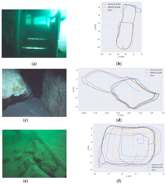 Trajectory comparison on AFRL dataset. (a,b) Submerged Bus scene image and trajectory plot. (c,d) Cave scene image and trajectory plot. (e,f) Fake Cemetery scene image and trajectory plot.
