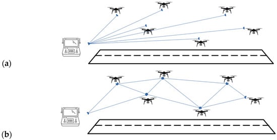 The coordination necessary for establishing a multi-hop network for video transmission is facilitated through the implementation of communication networks. Centralized and decentralized architectures are evaluated to determine which approach is more suitable for the proposed application. In centralized communication networks, a single central node oversees the routing and data flow, which can enhance management efficiency and control. In contrast, decentralized communication networks distribute these responsibilities across multiple nodes, fostering greater resilience and scalability in dynamic environments. Both network architectures are represented in Figure 1.