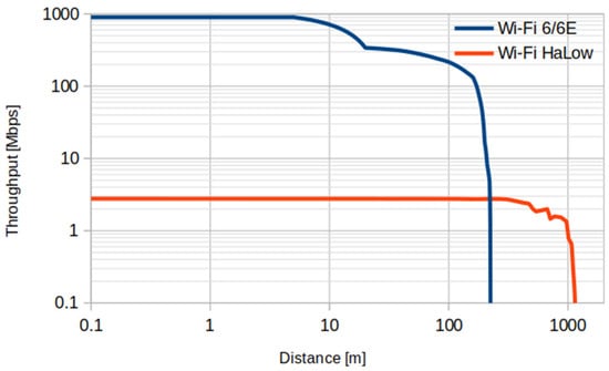 Regarding IEEE 802.11ah, a study identifying the throughput vs. distance performance for Wi-Fi 6/6E was carried out and used as a reference for the link capacity estimations. For this case, the AX210 chipset was employed and configured to operate in the 6 GHz band with a bandwidth of 80 MHz. Figure 2 also shows the throughput values measured for Wi-Fi 6/6E.