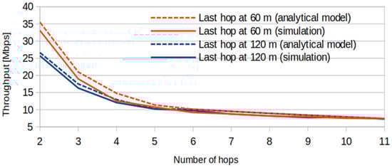 After trying different values for pe, the one that minimized the error relative to the results provided by NS-3 was 0.06. Figure 3 presents the results from applying the obtained analytical expressions, comparing them with those obtained from simulations for the cases of 60 m and 120 m in the last hop. The behavior in both cases is quite similar, and, thus, the expressions found can be given as a good approximation for assessing the throughput performance of an IEEE 802.11 multi-hop network and serve as the basis for the path selection/formation mechanisms explained in the following sections. Note, however, that the values of and the interference range of n = 5 hops are specific to the propagation loss model used. These parameters must be reevaluated for different scenarios.